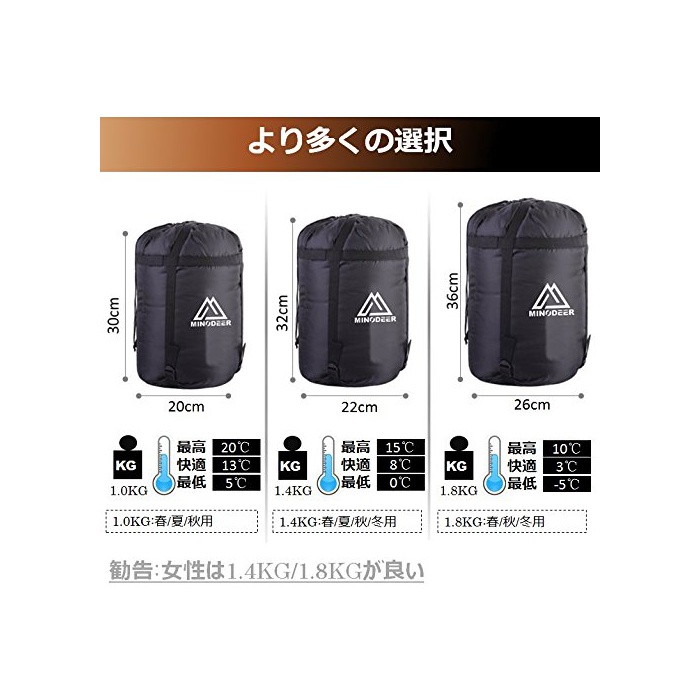 【쾌적 사용 온도】(약)0℃~【최저 사용 온도】(약)-9℃【【내용물】침낭 본체,수납대.