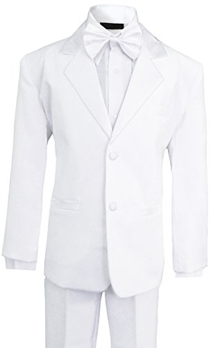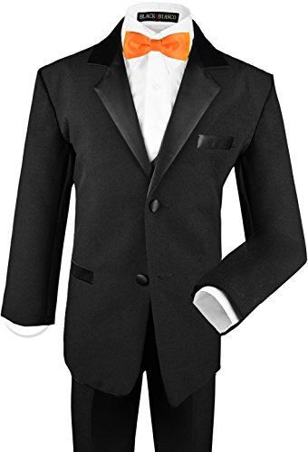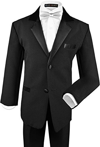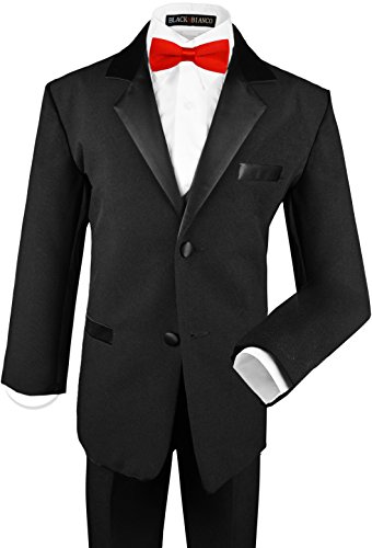 Our perfect Boys Tuxedo in Black comes in sizes for all ages. The suit is made out of polyester and comes in a full set so you don't have to purchase anything else to look adorably handsome. This tuxedo comes with a jacket (satin lapel), bow tie, vest, dress shirt, and slacks. Please refer to our image size chart for the perfect fit.Feature