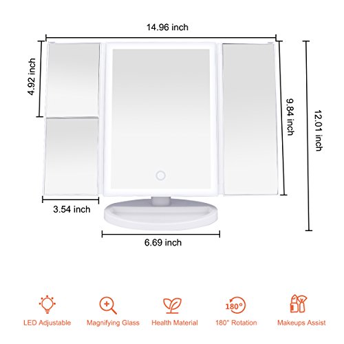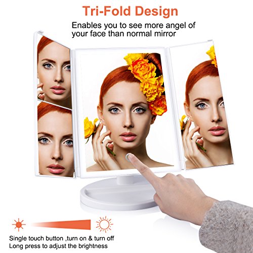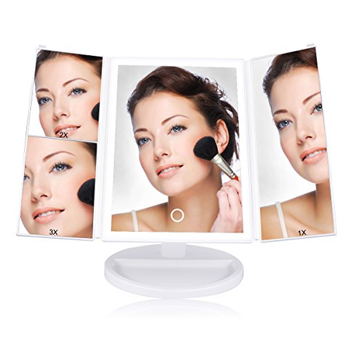 Lasuavy Lighted Makeup Mirror with 4 LED Tape-lights - Trifold LED Vanity Mirror with Touch Screen, 1x / 2x / 3x Magnification - White