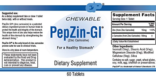 ReleaseDate : 2015-08-18 Studio : Endurance Products Company Publisher : Endurance Products Company Binding : Health and Beauty Product Description PepZin-GI is ideal for adults who want effective, yet gentle, drug-free support to help maintain the health and integrity of the stomach over the long term.* PepZin-GI features a patent-protected mineral chelate with over two decades of use in Japan. This highly stable compound results from combining zinc, an essential trace mineral, and L-carnosine, a protein building block, to deliver targeted benefits for stomach health. Zinc plays a role in a wide variety of functions in the body, but it's especially critical for maintaining the integrity of the protective membranes that line your digestive tract, including your stomach. This allows the nutrients to reside in the stomach longer where they provide nutritional support to the cells that line the stomach wall - without interfering with normal digestive function.* PepZin-GI is free of salt, sugar, yeast, wheat gluten, preservatives and common allergens (milk, ett, fish, shellfish, tree nuts, peanuts, wheat and soy). As with all dietary supplements, consult your physician prior to use if you have or suspect a medical condition, are taking any medications, or are nursing or pregnant. See label for more details. *These statements have not been evaluated by the Food and Drug Administration. This product is not intended to diagnose, treat, cure or prevent any disease. 0