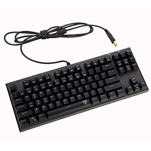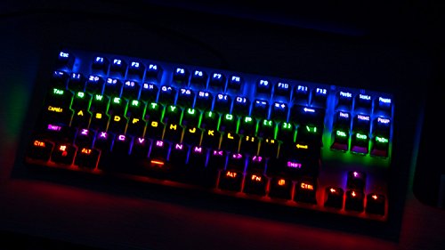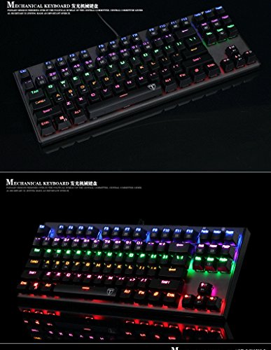 -. Feature : 87 keys RGB mechanical keyboard, constructed with floating keys, Black Mechanical Switches - Great gaming performance with tactile feedback and an audible click for typing. / Adjustable multiple backlit mode (9 modes), all the backlit modes are pre-programed, therefore key-by-key backlighting adjustment is not supported. / Anti-Ghosting with 26 Key Roll-over on USB - Every keystroke translates into accurate game play. / Gold plated USB interface guarantees efficient and stable data transmission (Note:RGB mechanical keyboards take a bit more power than the traditional keyboards, it wouble be better for them to work with desktop since some older USB 2.0 laptops may not be able to provide enough output. Similarly, it may work better with USB ports locating at the back of the computer case than those in the front). / Seal and Oxidation Resistance Design for better waterproof performance, longer using life.