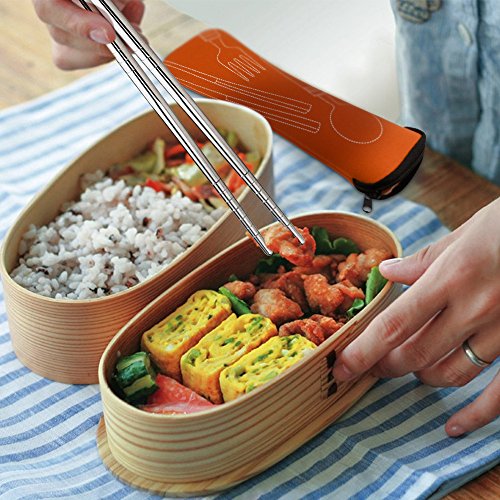 8 Pieces Flatware Sets Knife, Fork, Spoon, Chopsticks, SENHAI 2 Pack Rustproof Stainless Steel Tableware Dinnerware with Carrying Case for Traveling Camping Picnic Working Hiking(Orange,Light Blue)