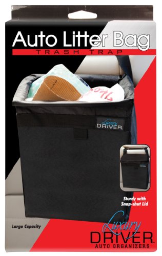 Luxury Driver Auto Organizers Auto Litter Bag Trash Trap hangs from the back of most vehicle head rests. The sturdy design features a snap-shut lid. Generous capacity and space-saving design makes cleanup accessible for all passengers. Black fashion outer material compliments any vehicle interior. Collapses for easy storage when not in use.