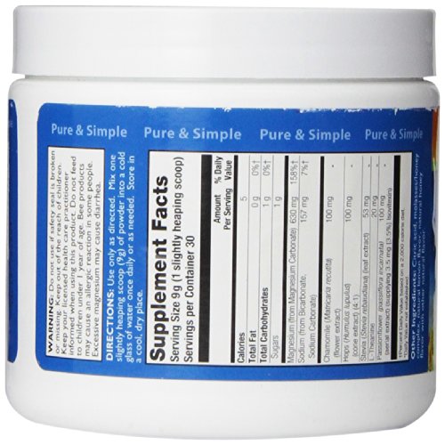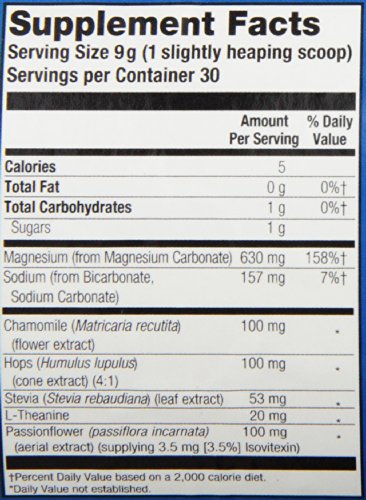 630 mg magnesium per serving. Also contains Chamomile, Hops, L-Theanine, and Citric Acid.