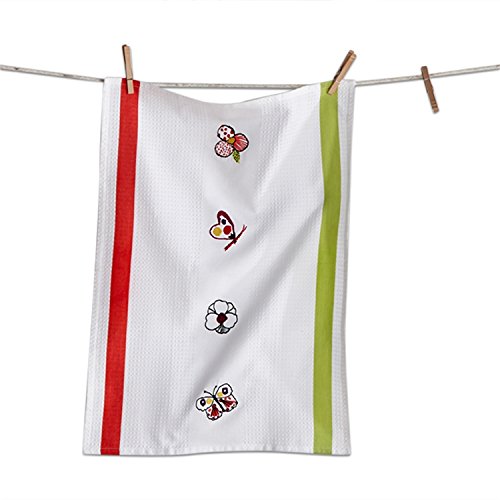 - Dish Towel features embroidered butterflies and flowers on a white background accented with red and green stripe details. Finely woven and waffle weave towel