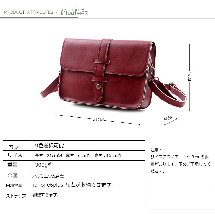 商品番号:WA021商品説明:◆伸縮性:有り◆厚さ:普通◆素材:PU、ポリエステル、金属◆バッグのサイズ:長さ:21cm約 高さ:15cm約 厚さ:6cm約◆色:写真通り◆重量:300g約◆商品内容:1xバッグ特徴:【軽量、携帯便利】バッグが、軽量で、携帯便利です。出掛けに最適!!コンパクトサイズのショルダーバッグ。内ポケット付きです。【ファッションなデザイン】欧米風なファッションの純色なバッグなので、通勤や通学にも適用します!!【多彩な色】9色が選択可能ですが、どの服装でも合います。簡単的にファッションなデザインのカバンです。おすすめです。