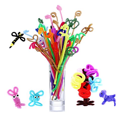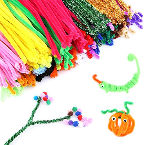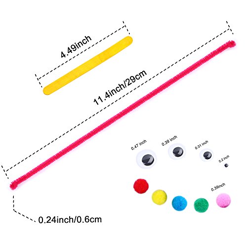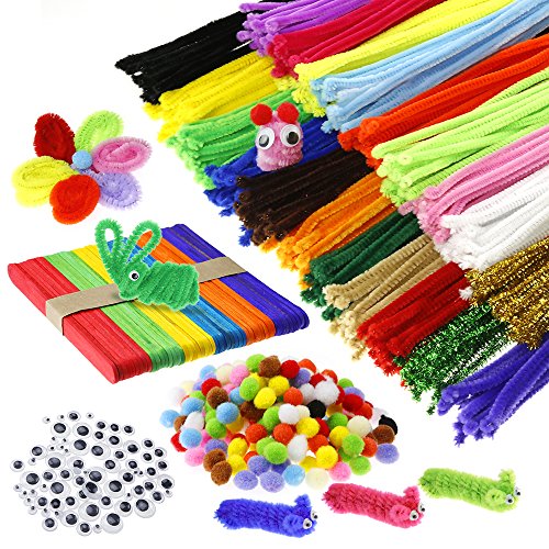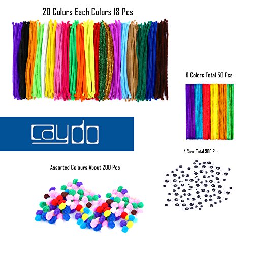 Caydo 910 Pieces Pipe Cleaners Set, Including 360 Pcs 20 Colors Chenille Stems, 300 Pcs 4 Size Wiggle Googly Eyes, 200 Pcs Pom Poms and 50 Pcs Craft Sticks