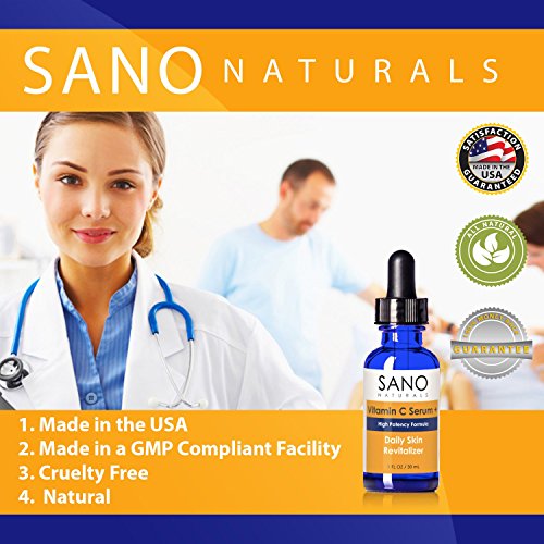 -. Feature : VITAMIN C SERUM = YOUR BEST SKIN FOR SP.R.ING 2016. Sano's modern, lightweight serum essence is infused with Vegan Hyaluronic Acid, Organic Aloe and Green Tea. Get ready to unleash your skin's youthful resilience and healthy looking radiance. / THE BEST FORM OF VIT C AVAILABLE. Sano Naturals C Serum for Skin contains Sodium Ascorbyl Phosphate, a form of Vit C that is widely considered the highest quality, best form available for the face and antiaging skincare. Help restore collagen elasticity and firmness, and significantly impact signs of aging. / NO PARABENS. NON-COMEDOGENIC. Sano Naturals is committed to organically-derived skincare. Our C-Vit Facial Serums are 98% Natural, 72% Organic, and specially formulated to hydrate and moisturize to help smooth the appearance of fine lines and wrinkles. / 600 5-STAR REVIEWS MAKE THIS AN ANTIAGING SUPERSTAR SERUM. With soothing, softening and firming ingredients - like Ferulic Acid and Green Tea Extract - our serum is an anti-aging, anti-wrinkle panacea. Just check out reviews from over 800 satisfied men and women. / MONEY BACK GUARANTEE- There is absolutely no risk to you when you order now! If you are not completely satisfied, simply contact us and we will give you a full refund, no questions asked (you do not even have to return the product).
