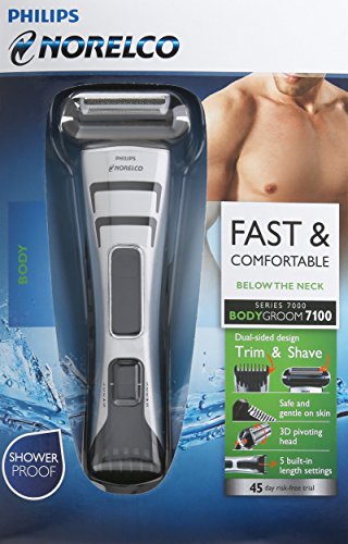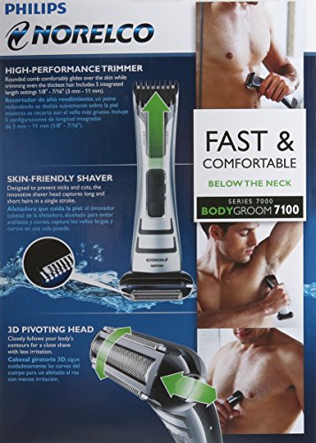 The Philips Norelco Bodygroom 7100 (Model No: BG2040/34) allows you to trim and shave conveniently and safely below the neck with an innovative all-in-one design. The dual-sided shaver and trimmer gives you the flexibility to shave and trim with just one product. The built-in trimming comb with 5 length settings comfortably glides over the skin while trimming even the thickest hair. The shave head prevents nicks and cuts while capturing long and short hairs in a single stroke. The 3-D pivoting shaving head closely follows your body's contours for a close shave with less irritation. The maintenance-free blades self-sharpen to ensure a precise, even trim and shave every time. Use wet or dry, in or out of the shower, simply rinse the device under the faucet for easy cleaning. The high-performance battery provides up to 50 minutes of cordless use after a 1 hour charge. Bodygroom 7100 comes with a 45 day risk-free trial and a full 2-year warranty. For best results, replace shaving heads with BG2000 replacement heads every 12 months. Packaging Includes: Electric groomer, charging stand, power cord and cleaning brush.Feature