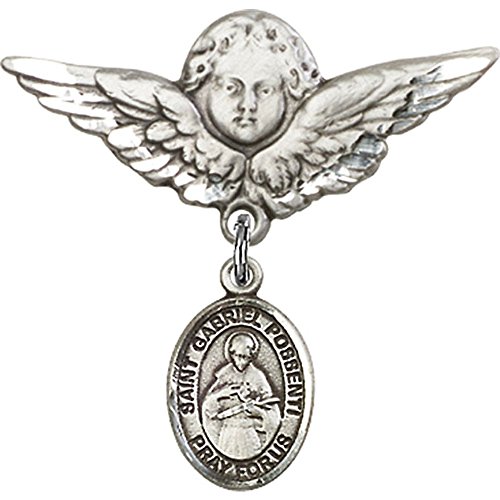 -. Title : Sterling Silver Baby Badge with St. Gabriel Possenti Charm and Angel w/Wings Badge Pin 1 1/8 X 1 1/8 inches