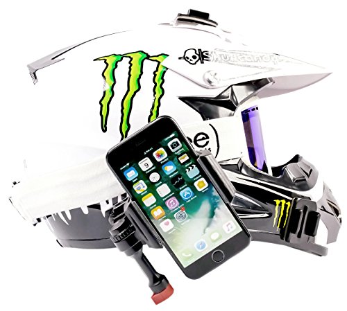 -. Feature : Compatible with iPhone 7, 7 Plus, or even accompanied with a protective case housing. Mount can fit phones up to 3.75" in width. / Attach your iPhone to your motorcycle or bike helmet with the strong adhesive sticky mount and take POV videos on the go. / Attach with the included (1) curved and (1) flat adhesive mount. Switch between mounts with a simple buckle clip attachment. / Swivel your phone up and down 180 degrees to find your perfect filming angle, edit and watch on the go. / Smartphone clamp holds your phone secure, so you can ride with ease. Not recommended for extreme high speeds, for the best results, keep your speed under 50mph