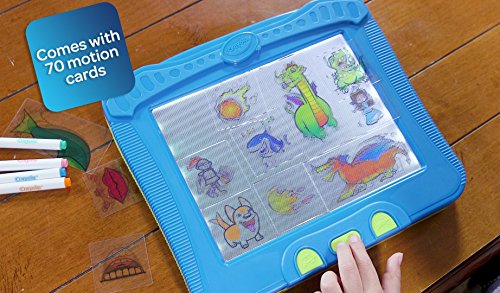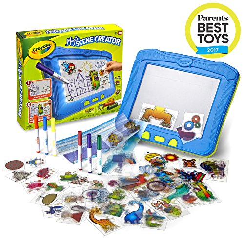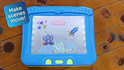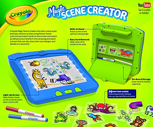 Create vibrant drawings and bring them to life with the Crayola Magic Scene Creator. Use the included six washable gel FX markers to draw a scene, and then add action cards to create a unique story. Once the action cards are placed on the Magic Scene Creator, they will begin to move like they're animated, and the buttons on the side of the unit let you choose the speed of the animations. Young artists can draw cars and add spinning wheels, draw birds with wings that appear to flap, and more. With 70 action cards in 5 fun themes, there are virtually unlimited combinations to create. The gel FX markers wipe off the screen easily with a damp cloth, and the screen unit features built-in storage for easy portability.Feature
