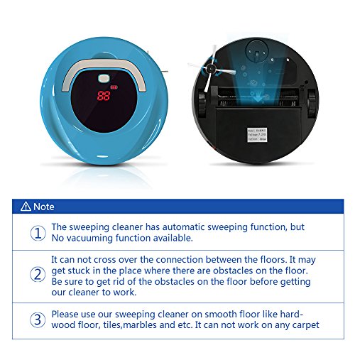 -. Feature : Robotic Cleaning and Easy Using : Motorized Automatic Vacuums Sweeper and Continuous Suction with Low Noise Mute Technology . Ideal for Pet Hair,Dirt,Debris,Ashes and More. / Versatile & High Clean Ability : High Suction and Dual Rotating Sweepers the Clear Ability is up to 98% High. Effectively Save the Housework Time and Create More Idle Time for You After the Whole Day Tired Work. / Infrared Induction: Infrared induction to Wall and Furniture and Turn Direction in Advance.Cliff Sensor Could Sense the Stairs and Adjusts Direction so It Could Proceed to Next Place. / Stylish and Ultra Slim Design: Fashion and Pretty Appearance with Handhold Make you Life More Colorful and Convenient. The Ultra Slim Design Make It Can Clean the Rubbish, Even the Dust Under Furniture of Height of 66mm . Item with 0.3L Dustin Box Capacity. / Rechargeable Battery with Led Screen: Item with Built-in 7.2V,NI-CD,1300mAh Rechargeable Power Battery. NI-MH Battery is Optional.Full Charging Time is 3 Hours for About 90 Minutes Run Time. Smart LED Screen Show the Power Capacity and Fault Code.