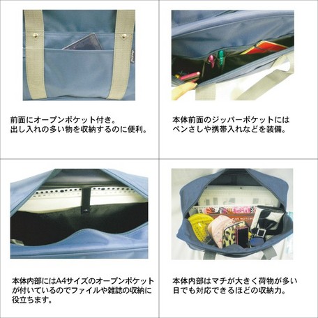 前面にファスナーポケット、オープンポケットを装備。小物の収納に便利です。