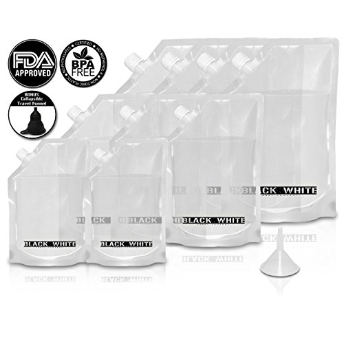 (9) Black & White Label Premium Plastic Flasks - Liquor Rum Runner Flask Cruise Kit Sneak Alcohol Drink Wine Pouch Bag Set Heavy Duty Reusable Concealable Flasks For Booze & Cocktails 4x32oz+3x16oz+2x8oz + Funnel