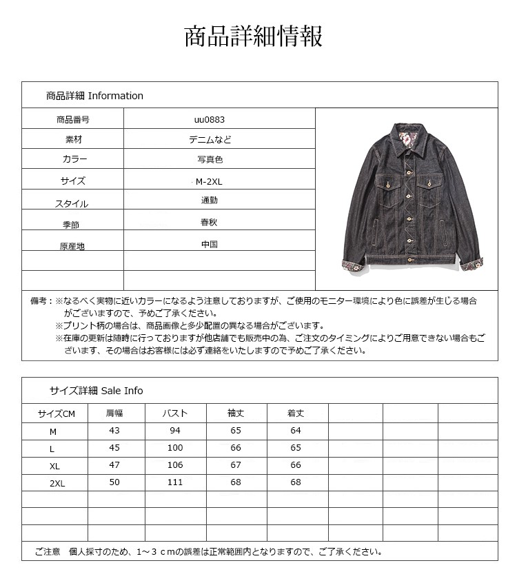 ■素材:デニムなど■カラー:写真色■サイズ:M着丈64袖丈65バスト94肩幅43L着丈65袖丈66バスト100肩幅45XL着丈66袖丈67バスト106肩幅472XL着丈68袖丈68バスト111肩幅50■原産地:中国