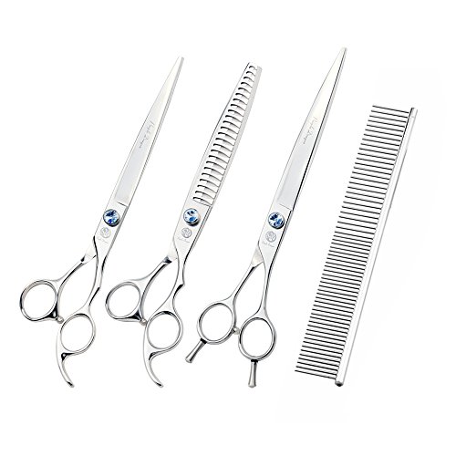 Size: 8.0 inch Hardness:62HRC Material: Japan 440C stainless steel Thinning Rate: 40-50% Tension is adjustable by hand Professional pet grooming shears kit for professional pet's shop and family 0