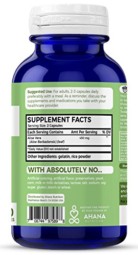 Studio : Ahana Nutrition Publisher : Ahana Nutrition Binding : Health and Beauty Product Description Are you looking for the most complete Aloe Vera Supplement for your body? Get the best value on Amazon: - Extra Strength Aloe Vera Plant Extract With 450mg Per Serving - Max Supply (100 Capsules Over 50 Days Supply) - 100% Pure and 100% Money Back Guarantee for 30 Days. Our Aloe Vera capsules are an all natural remedy that derives the best nutrients necessary to provide the ultimate health benefits. Our formulation is completely pure, potent and features no added fillers or preservatives. Every one of our products are always formulated in GMP compliant facilities and FDA approved locations, which go through strict third party testing and all of our products are made in the USA. Change the way you live and feel with our supplements. What Are The Benefits of Our Organic Aloe Vera: * Supports Blood Sugar Levels * Aids Digestion Bloating * Serves As An Anti-Inflammatory * Cleanses Detoxifies The Colon * Supports Kidney Health These Aloe Vera Pills feature a unique blend of ingredients backed on centuries of research to give you the complete solution. Thanks to Ahana Nutrition, it's never been easier to support your overall health wellness. Why Ahana Organic Aloe Vera Vitamins: - Made in the USA with quality ingredients - Only organic and natural items are used in the creation of this product, including Aloe Vera powder - Capsules that are easy to swallow and odorless - Pure extract with a maximum strength formula - Completely all natural complex with no sugars, salts, starches, gluten, soy or milk There is NO risk at all. Click the "Add To Cart" and buy now 0