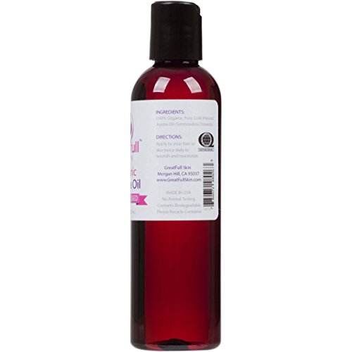 Are you looking for a natural way to have more radiant and beautiful skin and hair? Certified organic jojobo oil by great full skin nourishes your skin and hair the same as your body’s own natural oils -native Americans have utilized its many benefits for thousands of years -helps to reduce, prevent and reverse the signs of aging on skin -perfect for curing dry skin and problem areas such as crow’s feet, stretch marks and cracked skin -promotes hair growth -treats your skin the way nature intended Premium cold pressed jojoba oil heals and revitalizes your hair, skin and nails. Gives hair and skin more radiance, fullness, body and plump. Jojoba oil is an antioxidant which helps prevent skin dryness, fine lines and wrinkles. Not just another body oil . Scientific studies show that jojoba oil is extremely similar to the oils naturally produced by your skin. Jojoba oil has many beneficial properties: -quickly penetrates the surface to condition hair, skin and nails while promoting hair growth. -especially suited for sensitive or oily skin. -improves the body and shine of your hair while nourishing the scalp. What this means for you! -an extremely elegant and organic product that leaves your skin and hair looking more beautiful and radiant . -pure premium oil that is more effective than anything else on the market. -gentle enough to apply to the most delicate areas of your body and powerful enough to heal and protect your skin from harsh elements . We offer a money back guarantee so if you aren't satisfied for any reason you can get your money back with no questions asked. There is a limited supply at this price, so act now while it is still available . Please click the add to cart button at the top of this page to begin nourishing your skin today.Feature