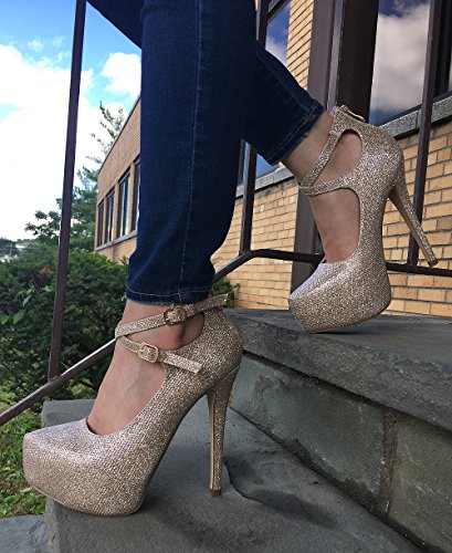 Product Description Almond-toe heels are designed in sparkly glitter upper and feature a classic toe straps, exposed sides, and an adjustable buckled ankle strap. Finished with a stiletto heel and a soft sole. 0
