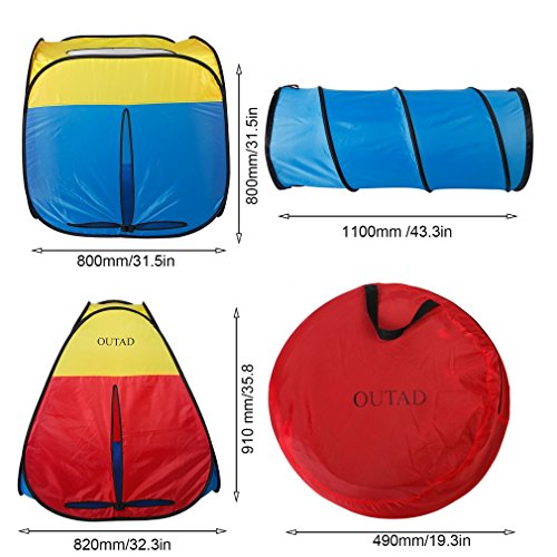 Specifications: Brand name: OUTAD Material: 190T polyester fabric with steel wire Square size: 33.46" x 31.5" x 31" Triangle size: 31.5" x 31.5" x 37.4" Tunnel length diameter: 43.5" x 18.6" Installed size: 106" x 33.46" x 31" Weight without bag: 3.56lbs Weight (bag included): 3.68lbs Color: Multicoloured