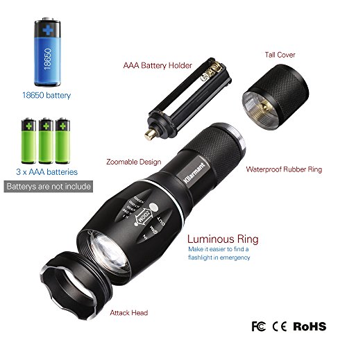 Luminous ring is to help you find flashlight quickly in the dark, different power options: 1x rechargeable 18650 lithium battery or 3 x AAA batteries (not included)