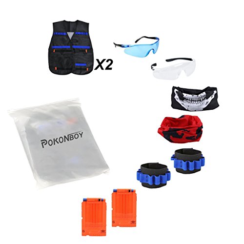 Complete Tactical Vest Kit: 2*Tactical Vest(size 21.26*18.5inch), 2 * Quick Reload Clips (6-darts) , 2* Hand wrist Hand , 2 * Protective Glasses , 2* Tactical Mask