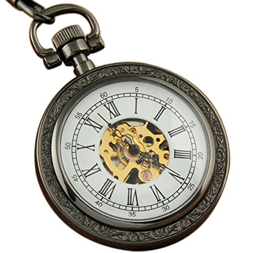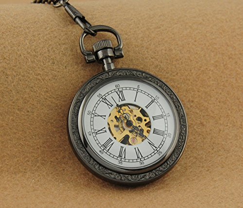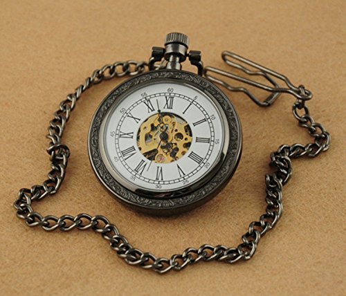 -. Title : VIGOROSO Men's Hand Winding Pattern Case Skeleton Chain Black Mechanical Pocket Watch
