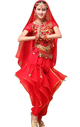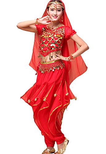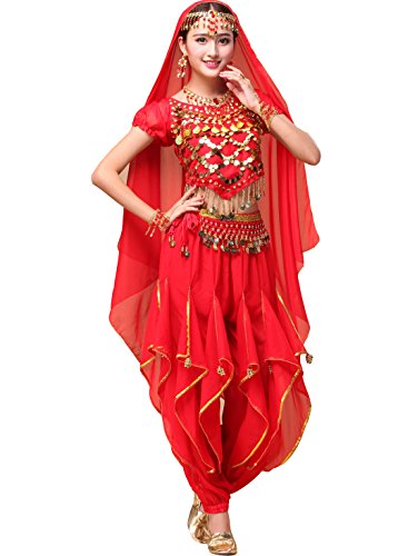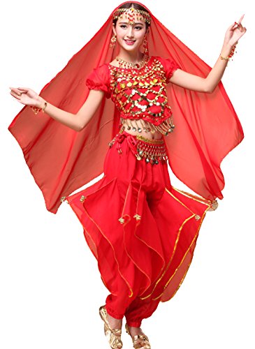 Astage Women`s Belly Dance Costume Set All Accessories Short Sleeve Top With Shells Red