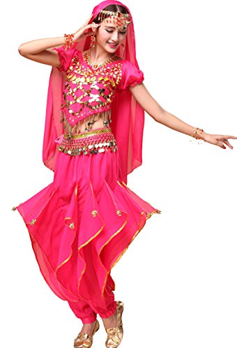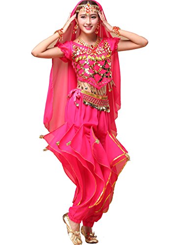 Astage Women`s Belly Dance Costume Set All Accessories Short Sleeve Top With Shells Hotpink