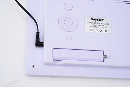 -. Feature : This unique 'High Resolution' digital day clock clearly spells out the full DAY of the Week, MONTH and DATE in large, bold letters - with no confusing abbreviations. Many seniors suffering from memory loss due to dementia, stroke, Alzheimer's or just advancing years, often have difficulty processing abbreviated words. / Ideal clock for people of all ages! Great for Home, Office or even Classroom use. The words Dementia, Alzheimer's or Memory Loss are 'not' P.R.Inted on the clock itself so it makes a great gift for those special loved ones, especially Grandma & Grandpa. It is quickly becoming a perfect Senior Care and In Home Care necessity. / This DayClox Digital Calendar Clock displays exact time in a large, bright and clear display that can be seen from across the room. It's bold, sharp & non-glare display is invaluable for the visually impaired and the elderly. / Features 8 different languages: English, Spanish, French, German, Italian, Polish, Dutch & Welsh. Display can be easily set to 12 hour or 24 hour (Military Time). Great for people with macular degeneration. / Overall Dimensions: 8.5" wide x 6.75" high x 1" deep (4.5" deep with Kickstand) 8" diagonal display screen. Can be used as a Desk clock or Wall clock. The clock requires an A/C adapter (included) to operate. Does not run on batteries. The clock is shipped with a removable thin plastic screen protector, to protect the screen during transit. " One Year Warranty".