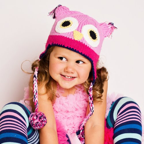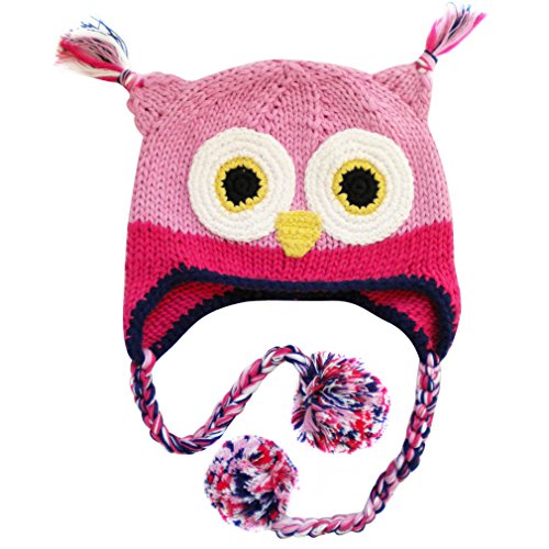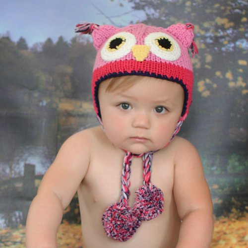 Product DescriptionAdorable owl beanie hat in pink and navy has earflaps with pom pom trimmed ties. Perfect for babies, boys and girls.0