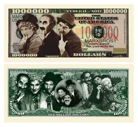 Product Description Special Million Dollar Bill featuring The Marx Brothers!! The perfect gift for all lovers of these screen legends. Same size as actual currency 0
