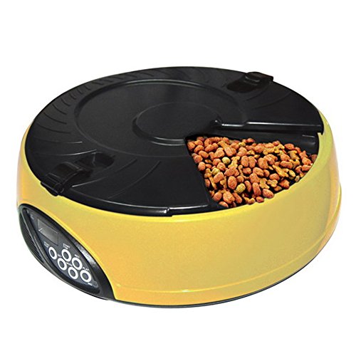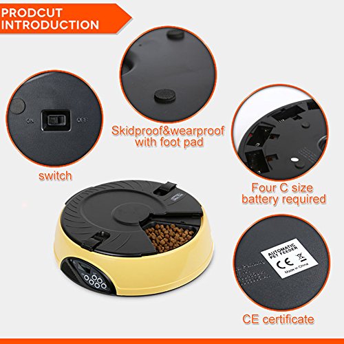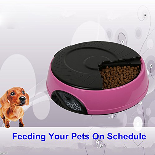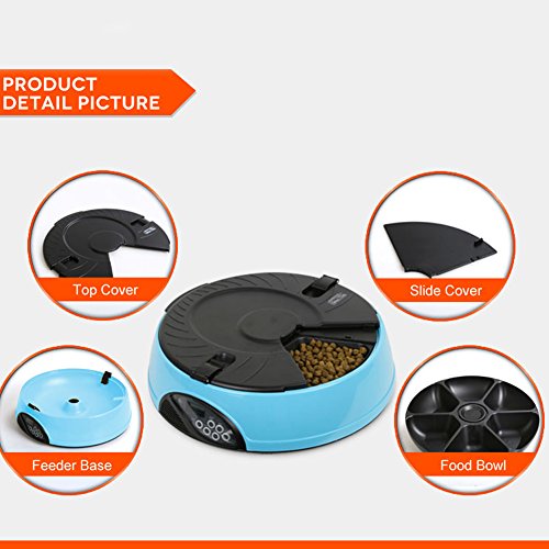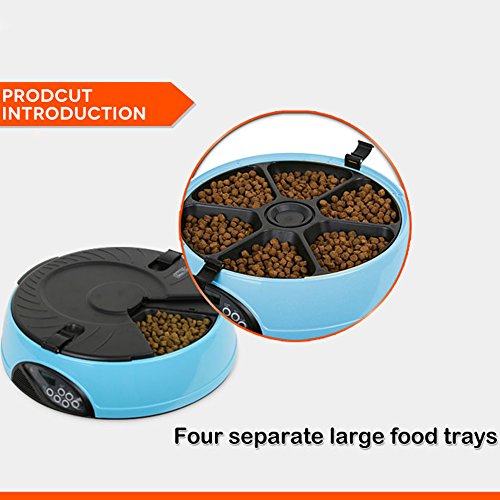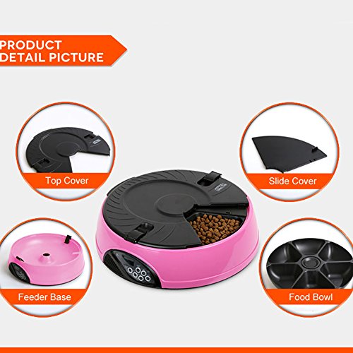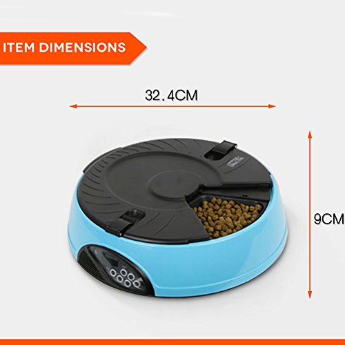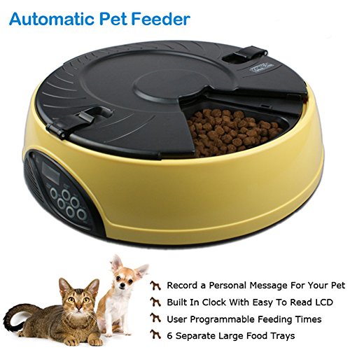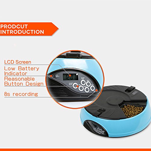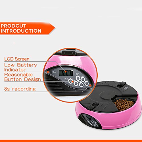 -. Binding : Misc. -. Brand : YK -. Feature : Easy user programmable for up to 6 different feeding times per day and lasting for 6 days; / 6 independent large food trays, prefer to keep regular size feeding food; / Build in microphone, speaker, low battery indicator and clock with easy to read LCD; / Automatically playing 3 times a 8 seconds personal recording message in the pre-set feeding schedule; / Regular feeding size and schedule, helping your pet to keep good regular eating habit -. Label : YK -. Manufacturer : YK -. PackageQuantity : 1 -. ProductGroup : Pet Products -. ProductTypeName : PET_SUPPLIES -. Publisher : YK -. Studio : YK -. Title : YK 6-Meal Automatic Dog Feeder Programmable Timer Pet Cat Puppy Animal Food Supplies Bowls Water Trays Electronic Station Container with LCD Display