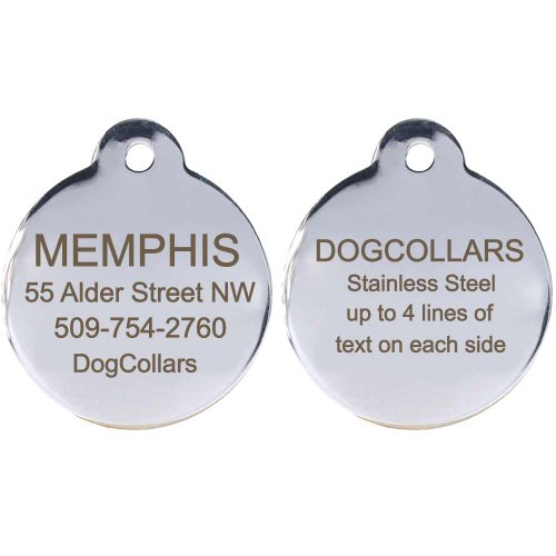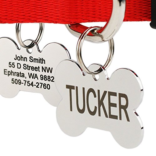 Product Description Premium stainless steel pet tags. Strong, durable, and long lasting pet tags for your pets. Includes 4 lines of info on each side such as pet name, phone number, or home address. Free shipping. Order includes a split ring attachment. 0