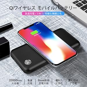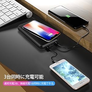 3-in-1で、2USBポート同時充電可能、通常のモバイルバッテリーとして両用でき、ワイヤレス充電で最大3台まで同時充電可能です。