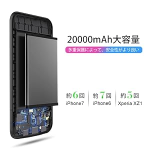 • 【申し分ない超大容量】:20000mAhの大容量モバイルバッテリーで、数回充電でき! iPhone7に約6回、iPhone6に約7回、Xperia XZ1に約5回電ができます。電池切れの不安から解消され、ビジネス、業務用、旅行や出張などに最適です。おまけに、急速な充電スピードを持って(出力:5v-2.1A(max)、入力:5v-1A)、想像以上にかなり早く満タンになれます。