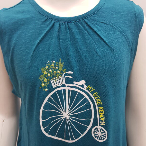 민소매 A라인 티셔츠입니다.꽃자전거 포인트 스타일로 쫄바지등에 코디하기 편한티셔츠입니다.