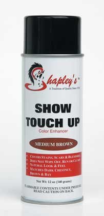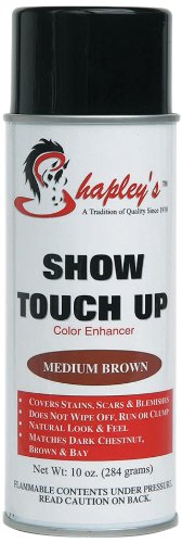 Studio : Shapley's Equine Grooming Products Publisher : Shapley's Equine Grooming Products Binding : Sports Product Description Shapley's Show Touch Up Medium Brown Color Enhancer will safely and effectively cover stains, scars, blemishes and unwanted flaws. Safe and effective to use, it will not smear, wipe off or clump. Show Touch Up Medium Brown will not wash off in the rain, but can be easily removed with an oil based product such as Shapley's Hi Gloss. It can also just wear off with no harm to the coat. It can be sprayed in the tail for a fuller appearance. Show Touch Up Medium Brown is ideal for dark chestnut, brown and bay horses. Also safe and effective for use on dogs, small animals and livestock. 0