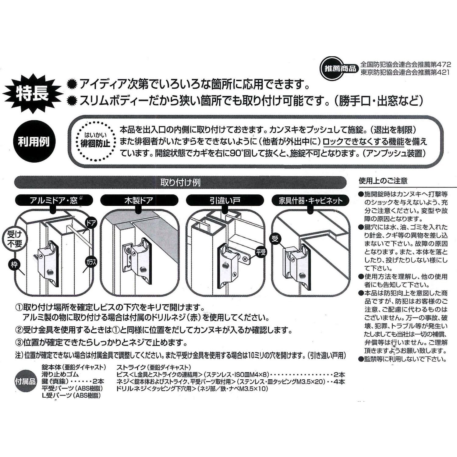 ● Drill screw for aluminum plate is included, so it is easy to install on the side door or sash window