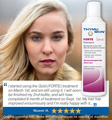 Daily usage of Thymuskin Forte Shampoo helps against strong hair problems*. It is used especially in case of longterm problems, to improve damaged and exhausted hair & scalp*. The cleansing- & caring shampoo gently cleans the scalp from dirt and already supplies it with the active agent. This way the scalp gets prepared for the treatment with the Thymuskin Serum Gel. Thymuskin Forte Shampoo contents a +100% higher dosage of the active ingredient complex GKL-02. It is highly effective, contents additional caring properties and is well tolerated*.