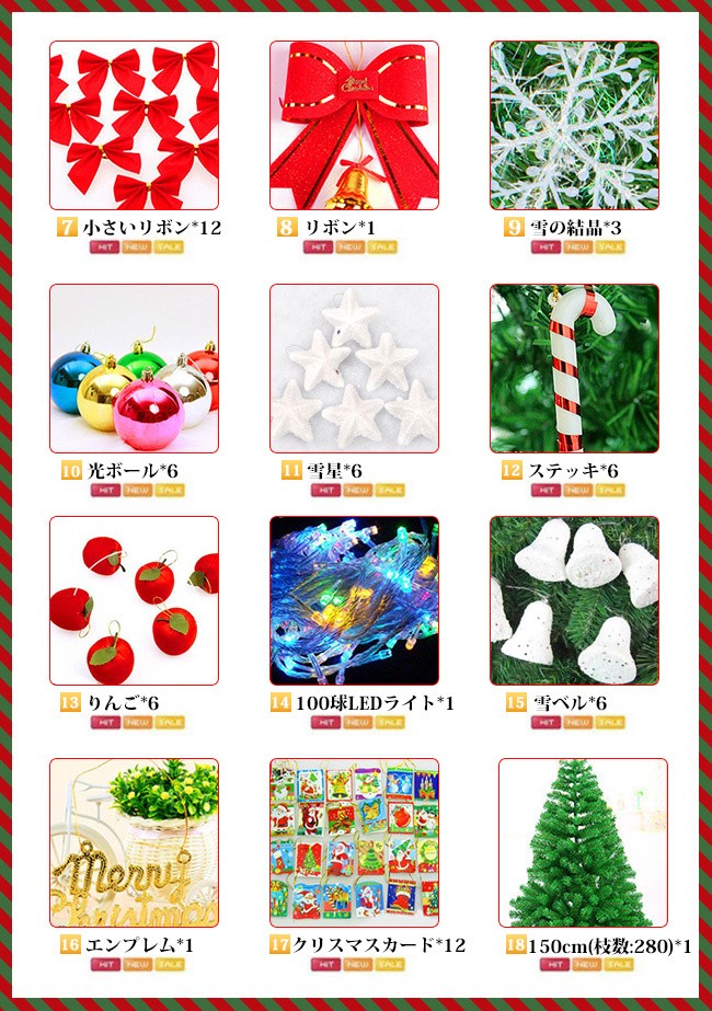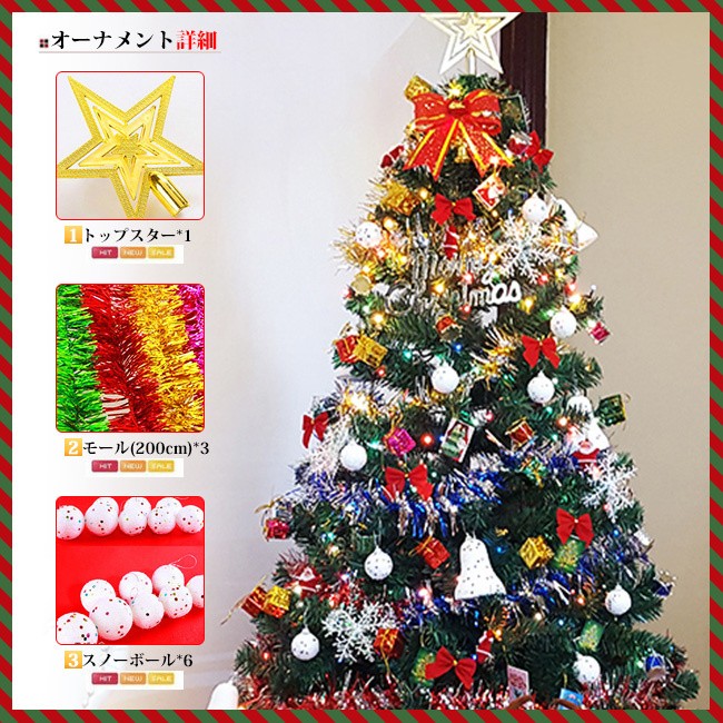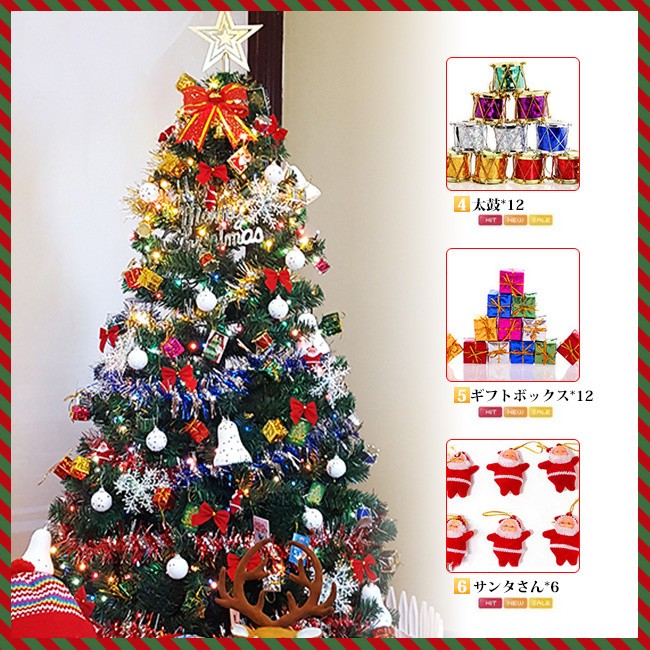 セット内容:トップスター*1 モール*3 スノーボール*6 太鼓*12 ギフトボックス*12 サンタさん*6 リボン*13(小さめ12個+大きめ1個) 雪の結晶*3 メタリックボール*6 雪星*6 ステッキ*6 リンゴ*6 ledライト*1 雪ベル*6 エンブレム*1 カード*12 ヌードツリー*1