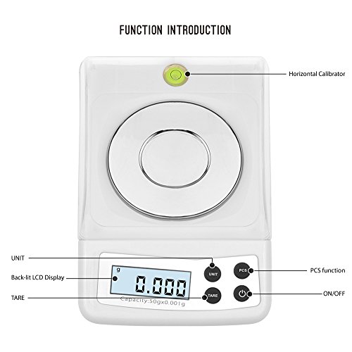 - DIGITAL MILLIGRAM SCALE - This is a high accuracy portable digital milligram scale. Deluxe design, flip top cover, back-lit LCD display, built-in horizontal calibrator, powered by 2*AAA battery (not included).