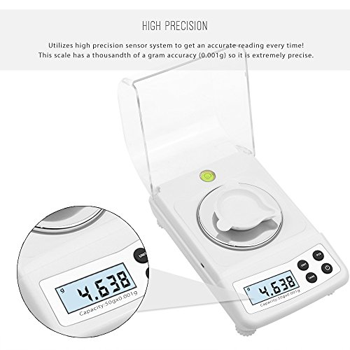 - HIGH PRECISION - Utilizes high precision sensor system to get an accurate reading every time! This scale has a thousandth of a gram accuracy (0.001g) so it is extremely precise. Size:9*13.8*7.2cm / 3.5*5.4*2.8".