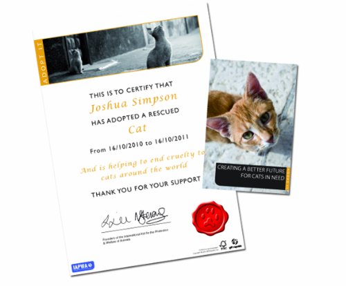 Studio : Gift Republic Ltd Publisher : Gift Republic Ltd Binding : Kitchen Product Description Adopt a stray cat in Borneo for 12 months and make a real difference to the lives these neglected animals. Includes easy-to-follow instructions -register online or by post to receive a supporter certificate and a cat photograph. Your adoption will assist International Aid for the Protection and Welfare of Animals (IAPWA), a registered charity.What's Inside:- Welcome Letter- Your Gift Explained- Gift registration form- Cats in Need booklet- Cats in Need poster- IAPWA leaflet- Caring for your Pet leafletA personalised supporter certificate and a cat photograph will be dispatched to you within 28 days. You will also receive newsletters directly from IAPWA. Newsletters are sent at the discretion of the charity.FAQsHow long do I have to register my gift?You need to register your gift before the 'register by' date on your gift registration booklet. We recommend that you register your gift as soon as possible.How long does my adoption last?Your adoption lasts for 12 months from the date of registration.How long does it take for me to receive my certificate and photograph?These will be dispatched within 28 days receipt of your registration details. Occasionally, factors outside of Gift Republic's control may affect delivery times.Can I visit the cats?International Aid of the Protection and Welfare of Animals (IAPWA) welcomes applications from volunteers to assist with projects -a great chance to offer some hands-on help. Projects may provide the opportunity to meet some of the animals that have been rescued. Which cat have I adopted?Unfortunately, because of the numbers of cats which need help, it is not possible to identify the specific cat which you are adopting. However your help is vital for the protection and care of these neglected animals. 0