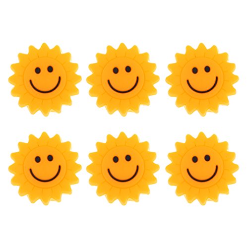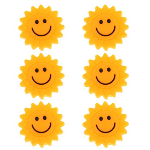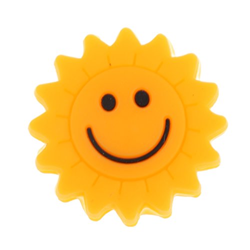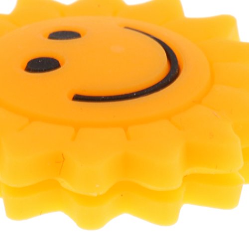Description: - 6 Pieces quality tennis racquet dampener - Made from soft, lightweight but firm silicone - Smiling sunflower pattern, lovely and pretty - Easy to get on and fits snugly on racquets - Can be a great gift for all tennis players Specification: - Material: Silicone - Color: Yellow - Size (Diameter x Thickness): Approx. 2.8 x 0.6 cm/1.1 x 0.24 inch