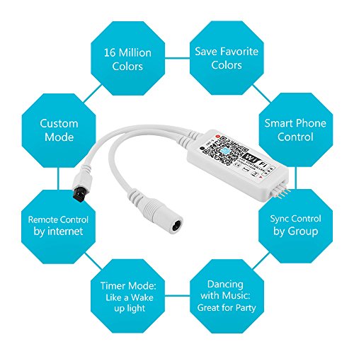 - Wifi Wireless Smart Controller : 16 Million Colors, Smart phone control, Timer mode, You can also make the lights lighting with the rhythm of music in your Smart Phone , By using 1 App to control many wifi controllers at the same time