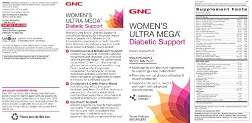 -. Binding : Health and Beauty -. Brand : GNC -. EAN : 0048107123772 -. Feature : Multivitamin with premium ingredients to support glucose metabolism / Promotes normal glucose utilization and insulin production / Supports circulatory, heart and eye health with advanced nutrient blends / Supplies powerful antioxidants to combat harmful free radicals / Supplies B-vitamins that are essential for energy production and metabolism. Each daily dose supplies a 50 mg B-vitamin complex including 400 mcg of folic acid that is essential for DNA formulation. -. IsAdultProduct : 0 -. Label : GNC -. LegalDisclaimer : Keep out of reach of childrenConsult your physician P.R.Ior to using this product if you are pregnant, nursing, taking medication, or have a medical condition. -. Manufacturer : GNC -. MPN : 80200779 -. PackageQuantity : 1 -. PartNumber : 80200779 -. ProductGroup : Health and Beauty -. ProductTypeName : HEALTH_PERSONAL_CARE -. Publisher : GNC -. Size : 45 servings -. Studio : GNC -. Title : GNC Womens Ultra Mega Diabetic Support - 90 Caplets -. UPC : 048107123772
