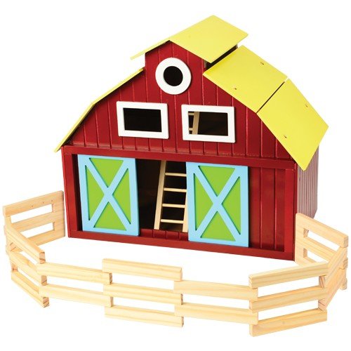 -. Feature : This big wooden barn has a removable roof, sliding front and side doors, a ladder, and wooden fencing / Barn measures 19" w. X 11½" d. X 16" h / Ages 3 yrs. +