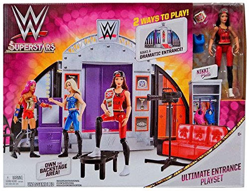-. Feature : The lights are bright, the fans are cheering and it's time to make your big entrance in the ring with WWE Superstars ultimate entrance Playset! / This exciting 2-in-1 Playset lets kids get their WWE Superstars ready backstage with a couch, table, vanity, closet, two molded fashions, hangers and camera to document the fun. / Then when the Superstar is ready, the Playset transforms with a turning platform to reveal the Superstar on the ultimate entrance stage! / Includes Playset, furniture, fashions, accessories and Nikki Bella action figure. / Colors and decorations may vary.